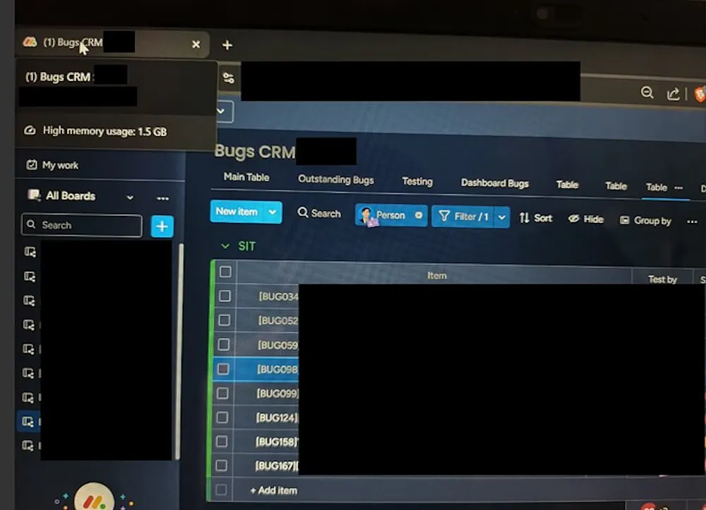 When I checked the tab usage, it was consuming around 1.5 to 1.6 GB of memory, even though the filtered board view had fewer than 10 items.