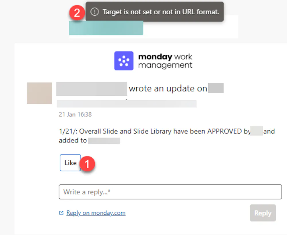 In this example, I received an email letting me know the update on a task. When I try to (1) click the Like button, it gives me an error (2) about the “target” not being set.