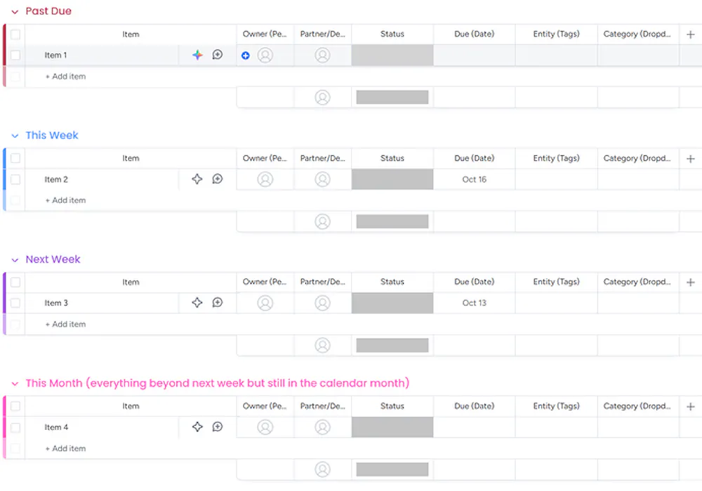 I would like to create a high level board that pulls ITEMS from a number of low level boards into groups like “Past Due”, “This Week”, “Next Week”, “Nex Month”, etc. so that the team can see near future tasks that others are working on. Similar to what the “My Work” does for personal tasks.