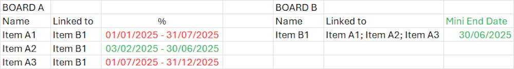 What I try to do is to find the minimum end dates of items linked to another item as illustrated below: