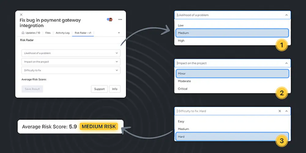 It instantly calculates a risk score and displays a color-coded badge right inside the item — helping your team stay focused and ahead of blockers.