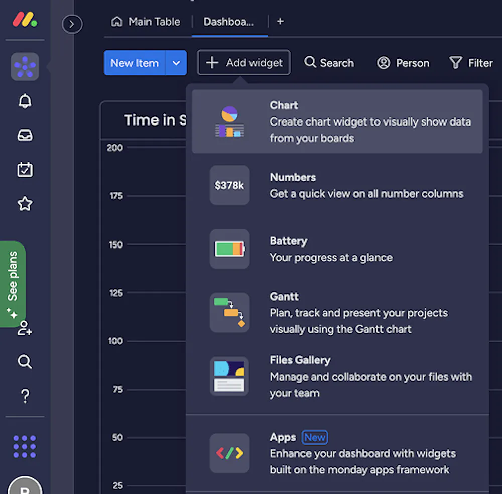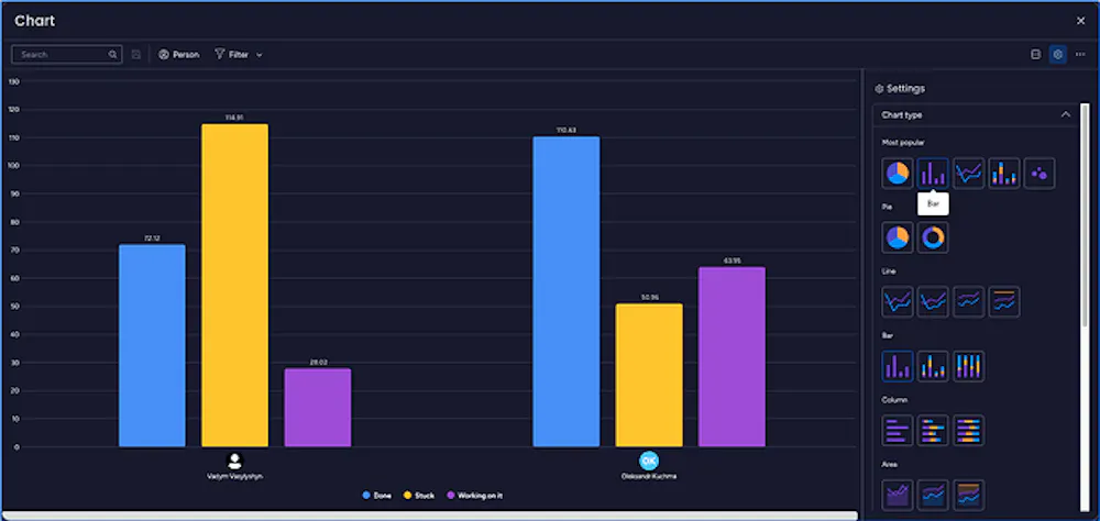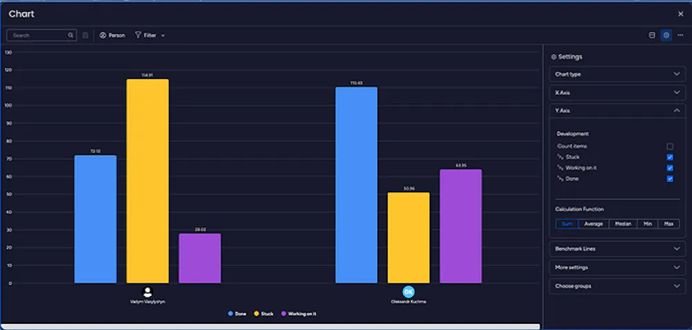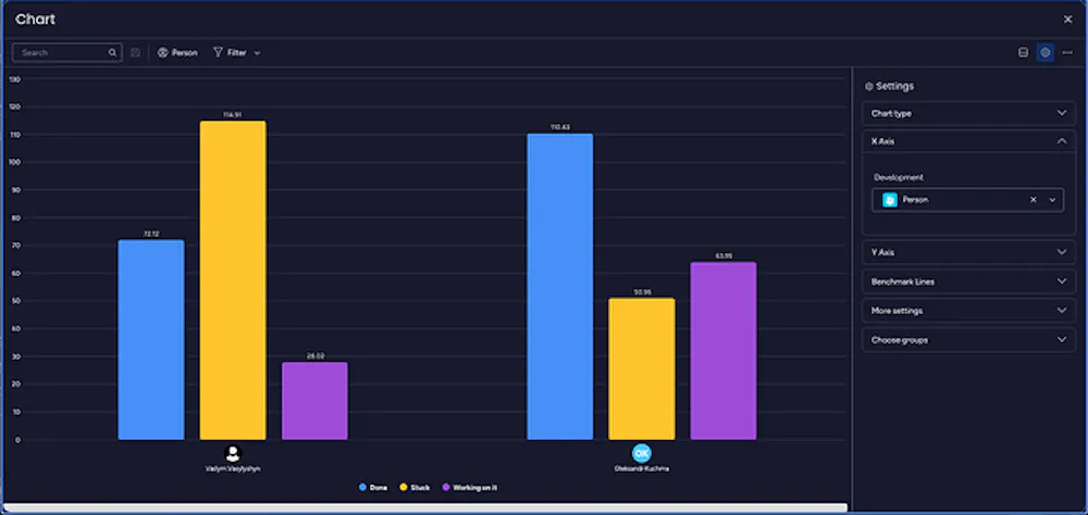 Note: This use case can also be adapted to track time in status by the board. Instead of setting the People type field on the X-axis, select the “Board” option to analyze time in status for different boards or projects.
