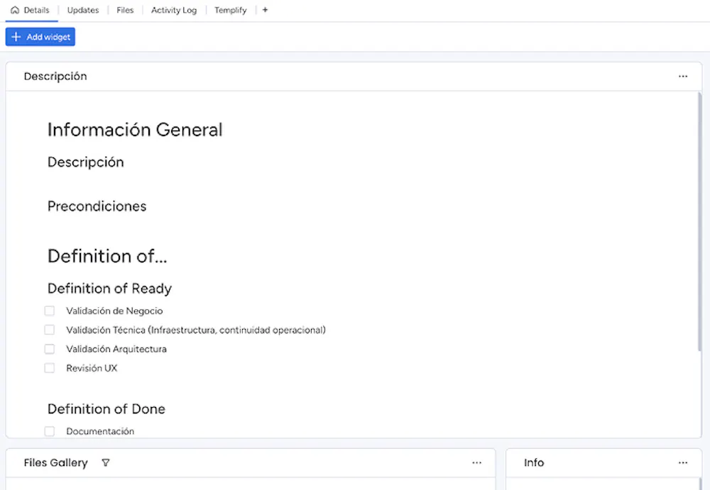 Hi everyone! I’ve been searching for a way to set the item description (within the widget) as a template but it seems that Monday Dev doesn’t have a native way to it.
