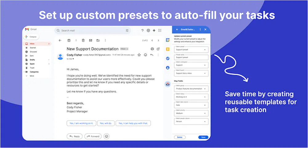 Use reusable presets to automatically fill in task fields such as board, group, status, priority, and more.