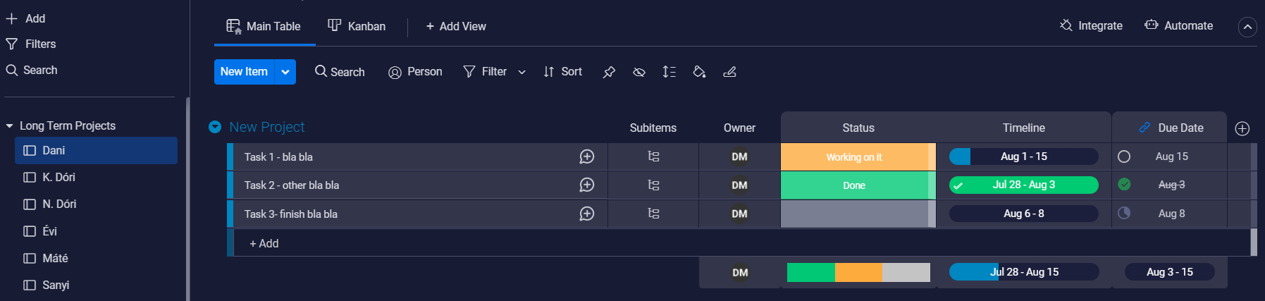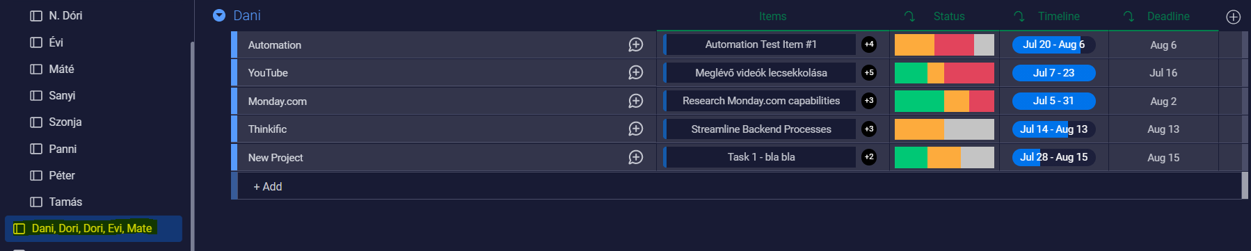 In another board i have connected the key indicators that our leadership can easily overview. Such as “Status”, “Timeline” and “Deadline”. In this board each Group represents one of the team members and each Items represent a project they are working on.
