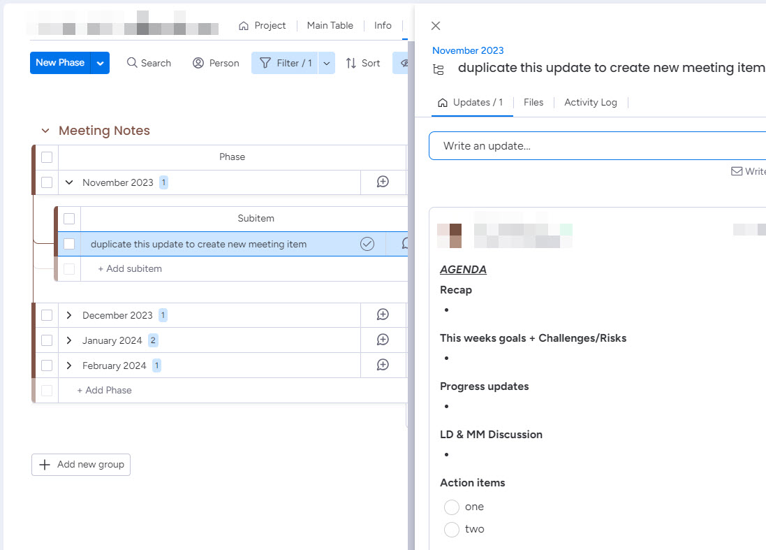 Some monday users put meeting notes in the items’ updates sections if the meeting pertains to a specific task or project that is being tracked as a line item.