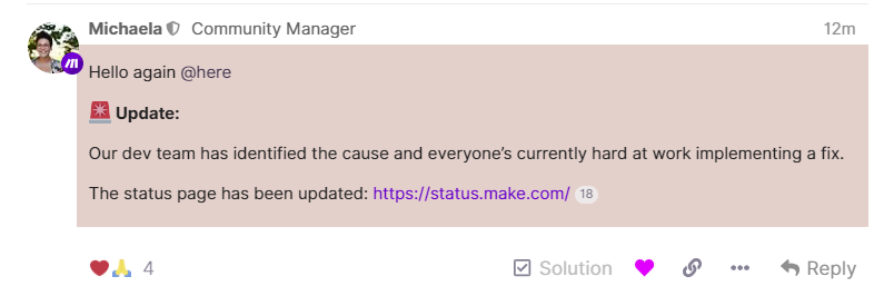 Thank you! I think you’ve found the issue. This should be resolved quickly since I’m sure a lot of users from both Make and Monday might be experiencing problems as we do.