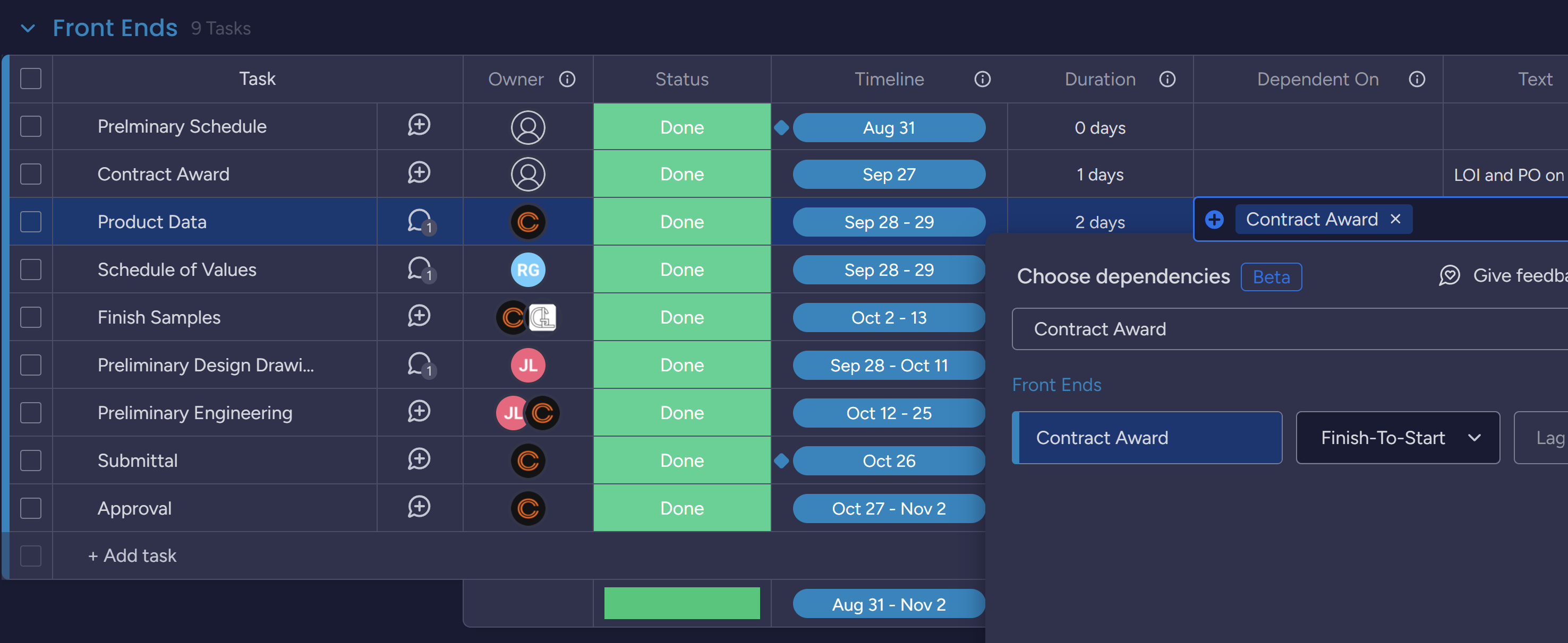 This is very weird. It all seems to be set up correctly. If you change the duration of contract award to 2 days, does the timeline of Product Data move to Sep 29-30?