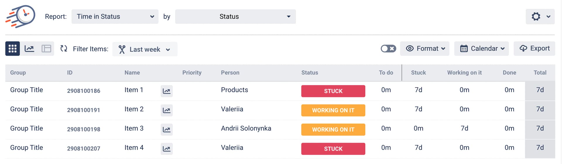 You can achieve it by moving item between statuses and than you will get time in status report Time in Status